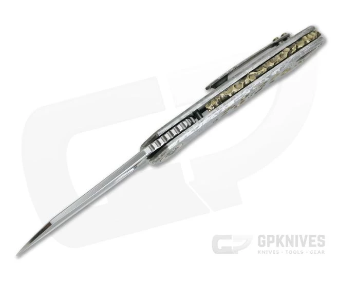 Designed by A. Kolesnikov, the Olamic Cutlery Whippersnapper is a followup to the popular Busker front flipper. Offering a more full size platform, the Whippersnapper retains the same top flipper design along with the premium materials, exceptional build quality and unique design and aesthetic for which Olamic Cutlery is known. Compact and elegant in design, the Whippersnapper is an excellent choice for everyday carry in any environment with a size that is easy to carry yet up to nearly any task. This version comes with a Satin, CPM-20CV Wharncliffe blade, Mokume pivot collars, Frosty titanium handles with Bronze Anodized Acid Rain Drop milling and matching clip.
