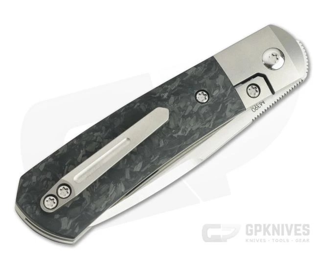 Handle:Â Reminiscent of a classic single blade trapper, the sweeping handle profile is formed by two thick titanium liners with integral milled bolsters. Stunning Marbled Carbon Fiber scales are supported by the liners and contoured for a comfortable, ergonomic grip that provides solid traction. Forming the liner lock mechanism, the rear liner is accessed via a cutout in the bolster and equipped with a hardened steel lock face for smooth, reliable operation for the life of the knife. Construction is rounded out with a titanium partial back spacer and satin Torx hardware.