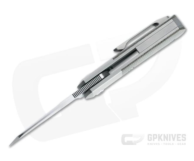 Blade:Â Following the pattern of his custom Apache, this knife has a Wharncliffe blade with modern front flipper deployment riding smooth on a ceramic bearing pivot over hardened stainless steel washers. Satin finished M390 comes with a nearly full flat grind and reverse Tanto point for solid performance. The compact size handles general EDC tasks with ease while being more permissible for carry.