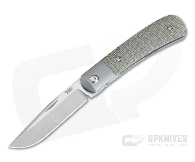 Handle:Â Modern and clean in form and function, the frame of the handle is formed by two thick titanium liners which also form the integral bolsters. Rugged Green Canvas Micarta scales are supported by the liners and contoured for a comfortable, ergonomic grip that provides solid traction. The rear liner is cut into a reliable liner lock mechanism which is accessed via a cutout in the bolster and outfitted with a hardened steel lock face for smooth, reliable operation. Construction is rounded out with a titanium partial backspacer and satin Torx hardware.