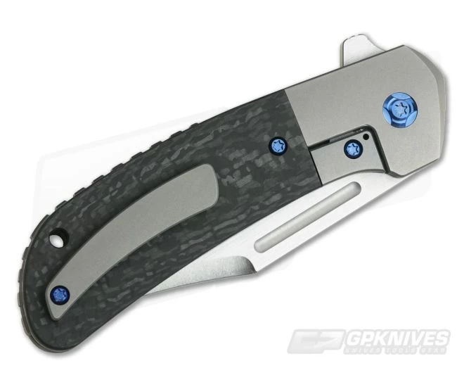 Handle:Â The handles are at once modern and classic. The knife is built with a frame formed by two thick, media blasted titanium slabs. These slabs are equipped with contoured Carbon Fiber overlays for comfort in the hand with integral bolsters in a traditional style. The back slab forms an integral frame lock with a steel lock face insert that delivers smooth operation and reliable lockup for safe use. The construction is rounded out with blue anodized titanium hardware and jimped backspacer.
