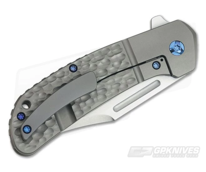 Handle:Â The handles are at once modern and classic. The knife is built with a frame formed by two thick, media blasted titanium slabs. These slabs are contoured for comfort in the hand with integral, faux bolsters and jigged “scales” in a traditional style. The back slab forms an integral frame lock with a steel lock face insert that delivers smooth operation and reliable lockup for safe use. The construction is rounded out with blue anodized titanium hardware and jimped backspacer.