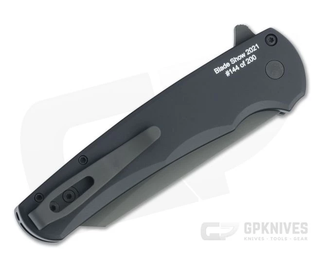 The Protech Knives Malibu is a manual flipper catching the daily carry community by storm. It sports a fast, bearing driven flipper deployment and button lock mechanism in a slim precision built design that is a joy to carry and use. A compact footprint makes it discreet for tactical use or as a larger gentleman’s carry option. This version comes with a black DLC coated CPM-20CV reverse Tanto blade, matching hardware and black anodized aluminum handle with mosaic abalone inlaid button. Marked “Blade Show 2021” and serialized of 200.