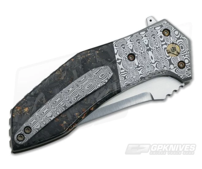 Randy Doucette Custom Barricade Flipper with a Copper Shred Carbon Fiber/Damasteel handle and a piercing CPM-S35VN compound ground tanto blade. This aggressive looking knife means business and is ready for action. It’s a great smaller-medium sized flipper from Randy. Brand new direct from maker.