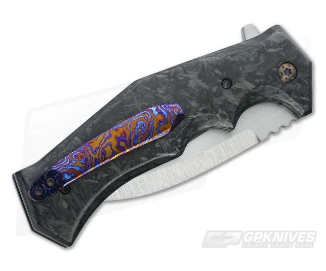 The Handle: The polished fire carbon fiber scales have an insane amount of shredded fibers jumping off the handle. Thick, anodized titanium liners and Ti hardware compliment the scales well and give the knife it’s strength. Fully tactical handle shape is ergonomic for ultimate control in the forward or reverse grip and a great well balanced feel in hand. Three titanium barrel spacers open construction on the Shogun finished off with a hand-sculpted TiMascus pocket clip for tip up carry.