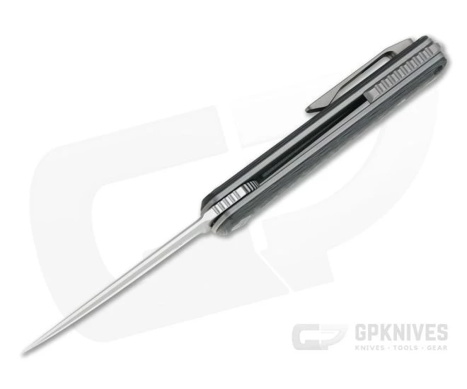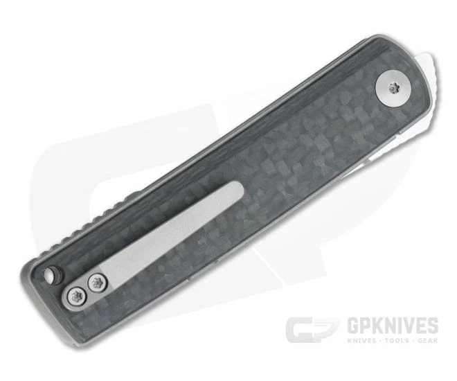 Handle: Matte gray titanium liners ride proud to the carbon fiber scales for a more contoured in-hand feel without the need for a thicker handle. The gently curving handle design is secure and comfortable in multiple grips. One of the liners forms the locking mechanism which is reliably secure and simple to operate. Construction is rounded out with a jimped partial back spacer and generous lanyard hole.