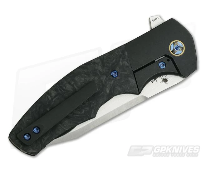 Handle: Contoured and black PVD coated titanium forms the foundation of the Crossroad creating the integral bolsters when paired with striking marbled carbon fiber overlays. The rear bolster/liner forms the lock which is equipped with a steel insert for smooth operation, longevity and reliability. A floating titanium backspacer is fit on gold anodized pillars which accent the custom anodized titanium construction hardware. The knife carries via a 3D machined tip-up, right hand, titanium pocket clip.