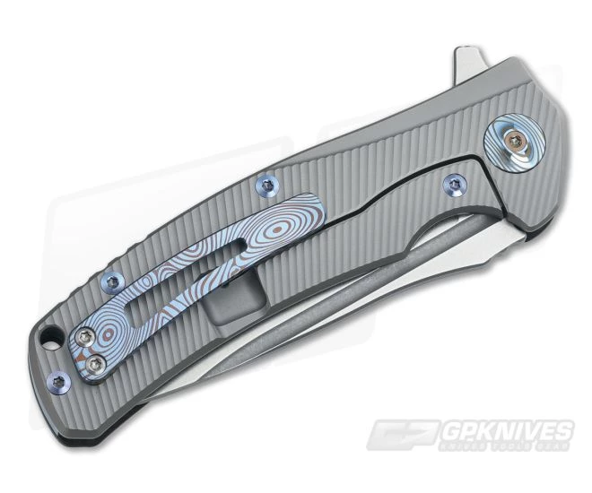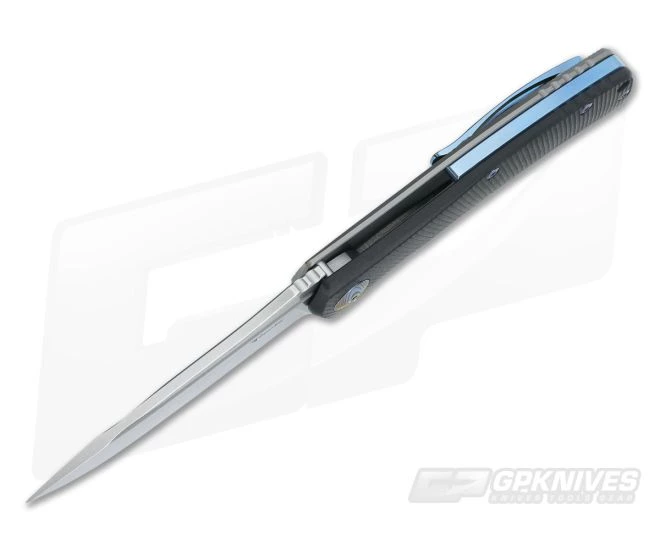 The Handle: The Horizon D has a precision 3D machined carbon fiber front with titanium back scale forming a frame lock. Replaceable hardened steel lock face housed within the handle helps extend the longevity of the lock and also acts to protect against overtravel of the lockbar. Blue anodized titanium backspacer brings the piece together with the help of blue anodized hardware, while the uniquely anodized blue/bronze pivot collar offers one last added touch. A matching anodized milled titanium clip has been attached for tip-up pocket carry.