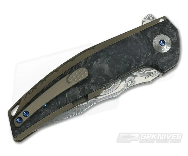 Handle:Â Milled from a solid slab of titanium the integral handle design delivers a clean look and enhanced strength. The titanium also forms the integral frame lock mechanism that delivers reliable lock up and smooth operation thanks to the hardened steel lock face insert. The sweeping spine transitions from a flat section near the pivot to a crosshatch milled contour near the end for exceptional ergonomics. Marbled carbon fiber inlays and Damasteel pivot colors bring the JACK to the next level of style. The titanium has a bronze anodized finish.