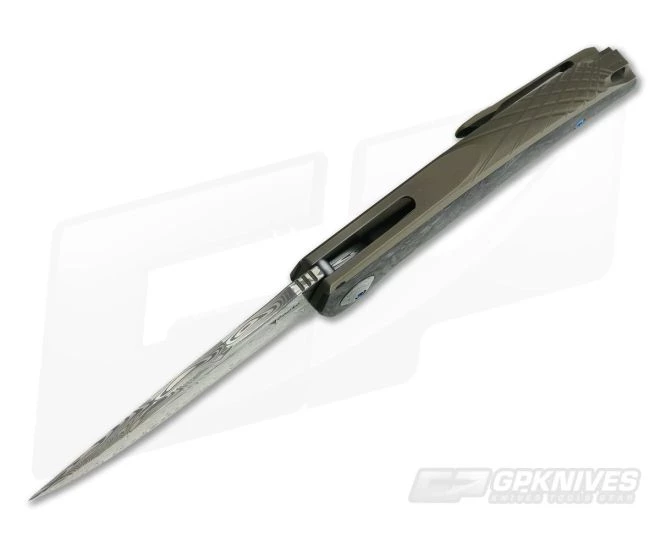 Blade:Â The blade is made from high performance stainless Damascus from Damasteel for excellent cutting performance. The eye-catching blade is made in a clip point profile with a scalloped spine and saber grind making for a great look as well as functional performance and finished in a striking satin finish. A ceramic bearing pivot and dialed in detent deliver amazingly smooth, reliable deployment of the 4 inch blade.