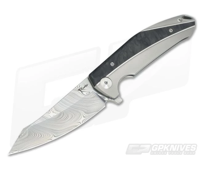 The K-1 Flipper from Reate Knives is a masterpiece in form, function and finish. Its body is sleek with clean lines flowing into the futuristic-looking, harpoon-tip Dense Twist Damasteel blade. This version is outfitted with titanium handles inlaid with elegant Marbled Carbon Fiber.