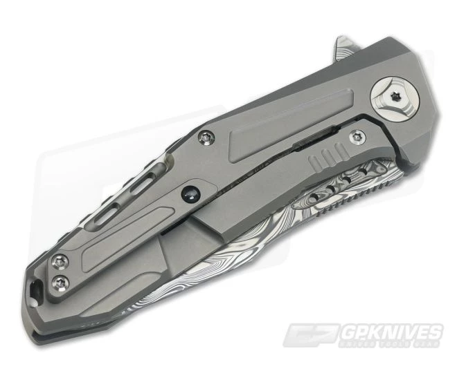 The Blade:Â Damasteel in their “Odin Heim” pattern delivers a pattern welded steel that is exceptionally beautiful while retaining the performance of a more modern, powder metallurgy steel. The saber ground blade gives a good combination of strength and slicing performance. A long swedge enhances piercing performance and gives a creates a scoop on the spine, a solid platform for power cuts. The milled pocket with holes adds a nice visual element. A ceramic ball bearing pivot gives the K-3 silky smooth deployment via the index flipper.Â