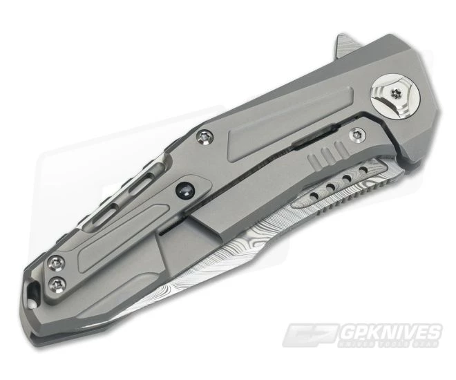The Blade: Damasteel in their “Dense Twist” pattern delivers a pattern welded steel that is exceptionally beautiful while retaining the performance of a more modern, powder metallurgy steel. The saber ground blade gives a good combination of strength and slicing performance. A long swedge enhances piercing performance and gives a creates a scoop on the spine, a solid platform for power cuts. The milled pocket with holes adds a nice visual element. A ceramic ball bearing pivot gives the K-3 silky smooth deployment via the index flipper.