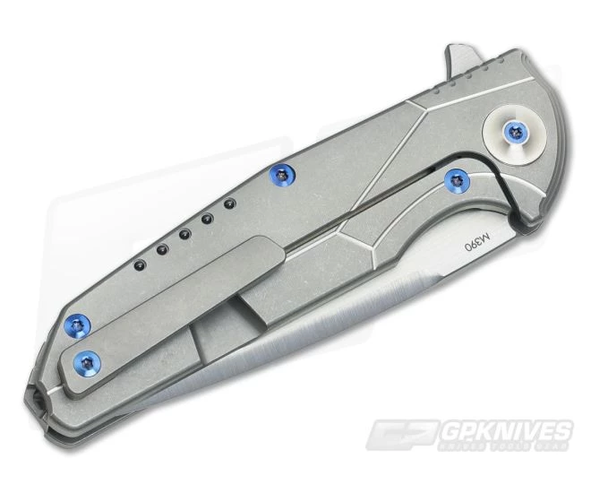 The Handle:Â Ergonomic and contoured, the K-4 is very comfortable in the hand and has no shortage of detail with fine milling, polished milled lines, carbon fiber inlays, and black ceramic ball insets. The K-4 is a knife that looks gorgeous without being extravagant. This version is tumble finished with matching backspacer and 3D machined titanium pocket clip. The clip is tip-up right hand only. Contrasting blue anodized titanium hardware adds a pop of color and the titanium frame lock delivers smooth, solid operation thanks to the steel insert which doubles as over travel protection.. Â