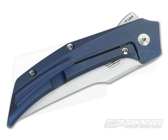 The Handle:Â Two solid slabs of titanium are held together using Torx construction giving the appearance of an integral design. It’s nearly seamless transition is performed flawlessly and sport an attractive Blue anodized finish. A lanyard post fits into the back with a streamlined pocket clip for tip up carry.