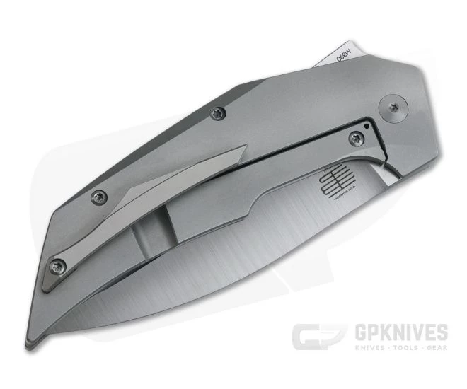 Handle:Â Two solid slabs of titanium fit together perfectly at the spine giving the appearance of an integral design. The handle slabs are finished with an attractive matte grey media blast and are held together with titanium Torx hardware with an inline hole for lanyard attachment. The front of the handle is outfitted with a precision inlaid piece of smooth Green Canvas Micarta that outlines a geometric arm of titanium that is echoed in the shape of the 3D machined titanium pocket clip on the reverse side. A simple, robust integral frame lock is equipped with a steel lock face insert/over travel stop and delivers solid, secure lock up and smooth operation.