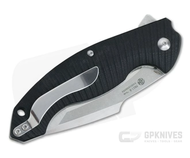 Blade:Â Made from satin finished, 3.5 mm thick Sandvik 14c28n stainless steel, the blade has a high height saber grind offering excellent slicing performance while retaining durability. A long harpoon top swedge delivers a fine tip at the Tanto point for controlled detail work as well as powerful piercing capability. The main cutting edge is a deep recurve that pulls material into the edge for aggressive slicing. The blade rides on a ball bearing pivot and decisively deploys via the index flipper tab with fast, smooth operation.