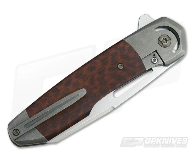 Handle:Â The titanium handle scales house a handsome Snakewood inserts that can be removed and exchanged for the included Lightening Strike Carbon Fiber Inlays as the mood takes you. The tumbled titanium frame forms a frame lock mechanism for solid lock up in all respects and a hardened steel lock face insert ensures smooth operation for the life of the knife. Ti Connector titanium pivot hardware and screws along with a bronze anodized titanium backspacer round out the construction.