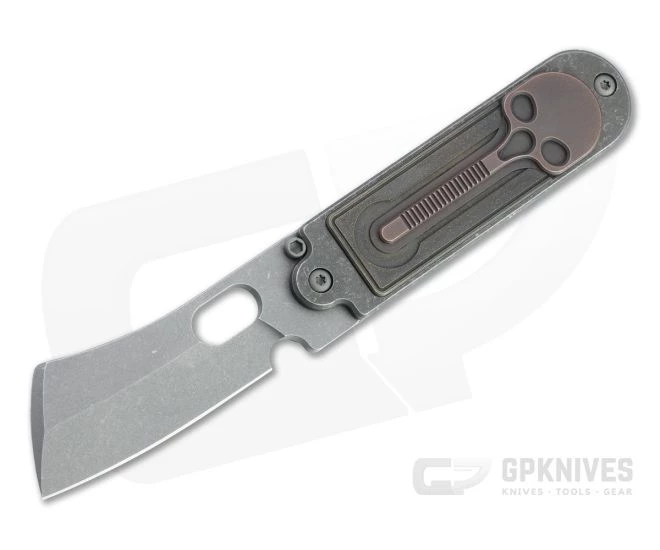 Designed, built, and custom finished maker Serge Panchenko, the mid-tech Bean flipper is a compact detent slip joint offering snappy deployment and sleek carry in a non-locking platform. The mid-tech version have high quality blades produced by Millit Knives. The pill shaped design of the handle offers a clean look and secure three-finger grip. This flipper version comes with an acid washed Nitro-V cleaver blade, matching titanium handles and clip, and an antique brass overlay with copper skull.