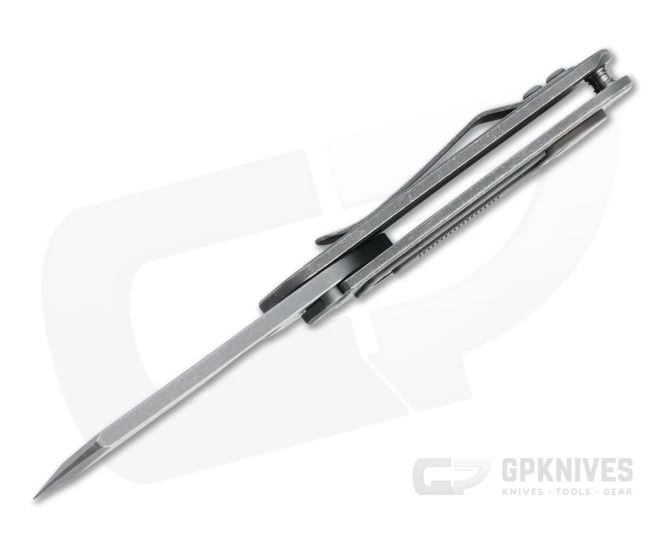 Handle:Â Joined via a single barrel spacer are two slabs of chamfered titanium, both acid washed and tumbled matching the blade. The front has an antiqued brass overlay with Gigeresque milled copper skull. A sprung detent ball provides secure tension in open and closed positions for the slip joint operation. A hole on the back allows for lanyard attachment.