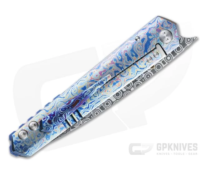 Handle:Â Dual slabs of contoured Timascus make up the handle with the performance of titanium and unparalleled visual appeal. The large handle is comfortable with plenty of real estate for large hands and traction from a jimped partial Ti back spacer and five milled holes backed by a stainless steel mesh for added visual appeal. Equipped with a hardened D2 tool steel lock face and ceramic detent, the integral frame lock is smooth and reliable with rock solid lock up. Sergey engraves his signature and serial number inside the back spacer.