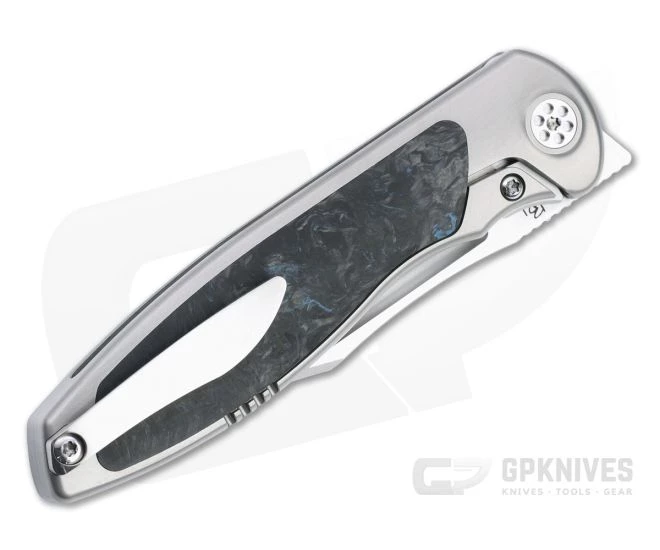 Handle:Â Contoured and matte glass bead blasted titanium slabs from the handle supporting stunning Marvel Blue carbon fiber inlays and forming a reliable and rock solid integral frame lock. A hardened steel lock face makes for smooth operation and long term reliability and includes the SBD Integral detent detailed below. The minimalist handle design is ergonomic in a variety of grips and secure in the hand without the need for aggressive texture making it fast in the hand. Satin finished hardware rounds on the construction.