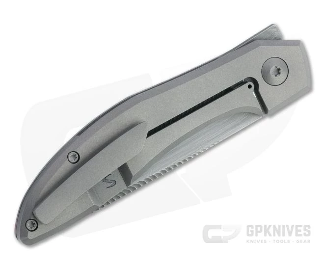 Handle: Solid titanium slabs joined with a partial back spacer to form the rock solid handle. Chamfered edges and a streamlined tapering handle provide a comfortable, secure grip. A blasted and tumbled matte gray finish is handsome and utilitarian, complemented by a smooth G10 inlay. The integral frame lock provides rock solid lockup for safe use. Includes custom cloth pouch, microfiber bag and signed information card.