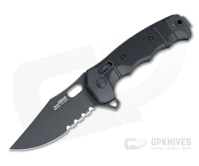 Based on the Award Winning, USA-made SOG Seal FX, the Seal XR is a large, high performance, XR Lock flipper delivering robust strength in a folding knife package. Full length, skeletonized stainless steel liners support durable, high traction polymer handles and house the high quality stainless steel blade. This version comes with black GRN scales and a partially serrated, black Cerakote coated, CPM-S35VN clip point blade.