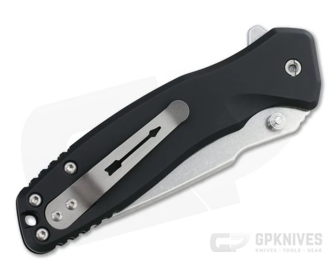 Handle: Black mil-spec hard anodized 6061 aluminum delivers a tough, lightweight handle joined with barrel spacers in an open back construction. Sleek, versatile, and ergonomic the handle has comfortably contoured edges with strategic jimping and milling for solid traction. The matte black finish is discreet while the plunge lock delivers smooth action and reliable lockup for safe use.