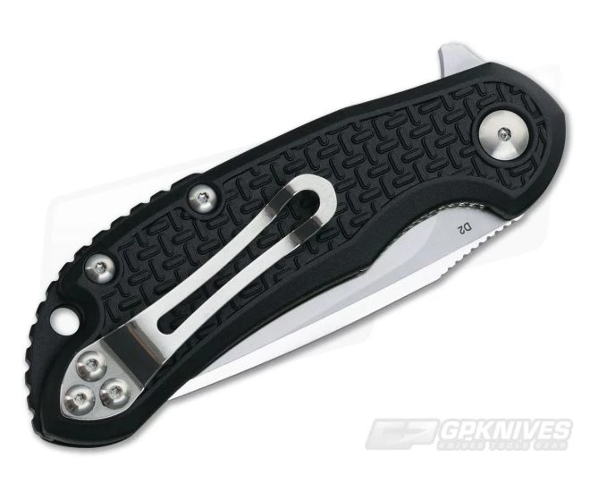 The Handle: The Black FRN handle is smooth around the edges with an inset texture pattern providing a solid grip. Rest your grip directly behind the flipper tab/guard or expand on that by using the choil. It actually makes the handle seem longer. There are full length stainless liners backing up the FRN. The show side in completely skeletonized for weight reduction while the lock is only slightly, as it creates the liner locking system. A slightly exposed notched FRN back spacer adds to the overall feel, superior balance and lanyard opportunity of the Mini Cutjack. A tip up pocket clip is included that may be flipped for lefty carry.