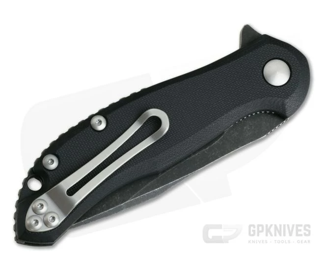 Blade:Â A 3.3 mm thick, black stonewashed D2 blade has a curving belly along the edge for excellent slicing performance. The nearly full flat grind pairs with a harpoon swedge clip point delivering a fine yet robust point for optimal piercing performance. It opens smoothly with an integral flipper tab riding on durable phosphor bronze washers. The dialed in detent offers smooth, snappy deployment.
