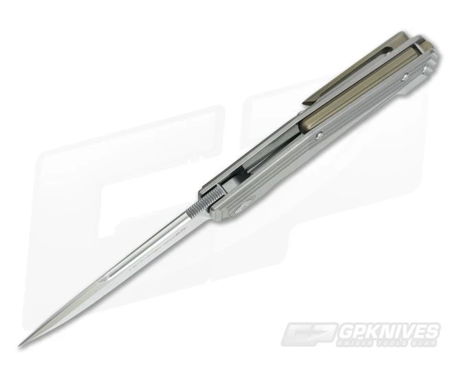 The Handle:Â The handles are made from stonewashed, CNC milled titanium that feels great in the hand even with the futuristic look. An inset stainless steel liner gives solid lock up and solid titanium backspacer is CNC machined and anodized for a pop of color which matches the pivot collars. The knife carries via a tip-up, right-hand only milled titanium pocket clip which is CNC machined and anodized to match the backspacer and pivot collars. A lanyard pin in the backspacer allows for inline attachment of a lanyard.