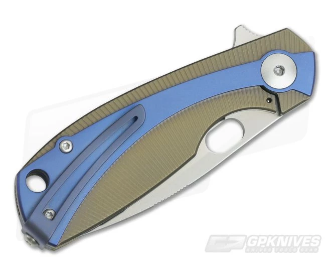 Handle:Â The handles are made from bronze anodized, CNC milled titanium that feels great in the hand. The sweeping titanium overlay adds a contoured feel to the handle as well as added visual interest. The titanium liner lock gives solid lock up and the small titanium back spacer is color matched to the overlay and deep carry titanium pocket clip. The pocket clip is attached to the end of the back spacer for enhanced discretion in carry and a generous hole makes for easy lanyard attachment.