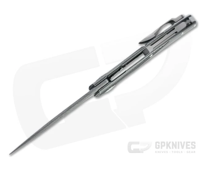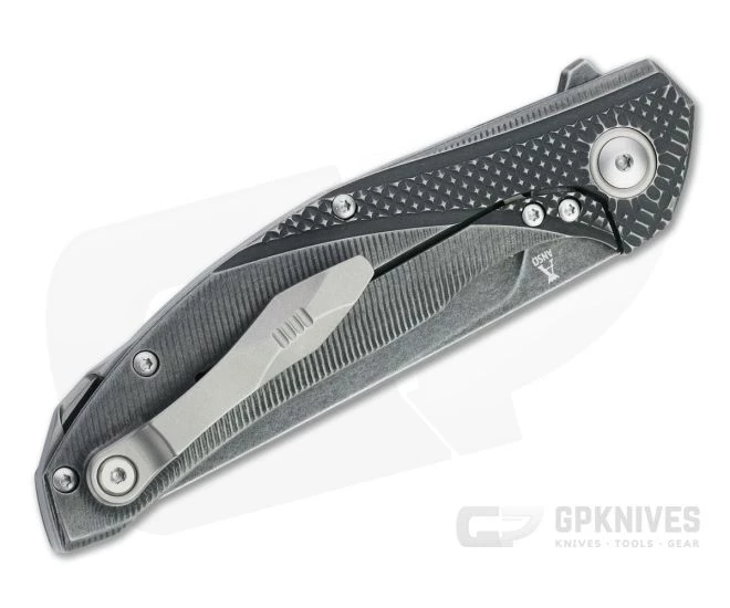 Handle: Milled and contoured titanium handle slabs have comfortable contours and radiating milled grooves framing 3D texture milling for traction and style. Gray titanium pivot collars and titanium back spacer complement the dark stonewashed finish while the steel lock face equipped integral frame lock offers easy operation and rock solid lockup. The partial back spacer has a signature Anso lanyard loop.