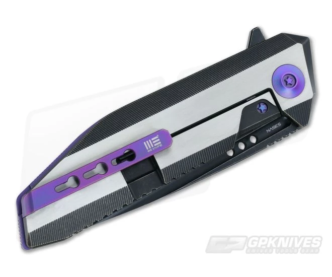The model 602 is a fresh new in house design with a striking tanto blade from WE Knives. A zesty flipper, this hefty knife has a solid feel and great build quality. This version of the 602 has a black frame with satin finished titanium flats and anodized purple hardware. Comes packaged brand new, direct from WE Knife Co.