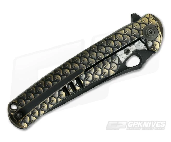 Handle: The Integral handle design has clean lines that highlight the eye-catching dragon scale milling while facilitating multiple grip positions. The spine of the handle is smooth, integral titanium adds durability, is comfortable in the hand and enhances the aesthetic appeal. The integral frame lock construction is outfitted with a hardened steel lock face insert for smooth, reliable operation on this deceptively simple folder. A bronze anodized finish rounds out this stylish piece.
