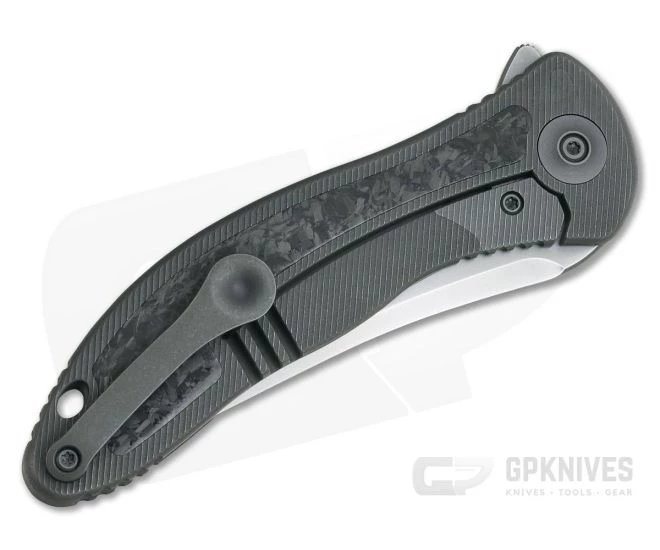 Handle: The Integral handle design has clean lines with a subtle sweeping shape that is complemented by the curves of the blade. A central palm swell and some strategic jimping on the handles offers a secure grip with the fully contoured design is comfortable in the hand. The smooth integral spine of the handle adds durability, is comfortable in the hand in multiple grips and enhances the aesthetic appeal. The integral frame lock construction is outfitted with a hardened steel lock face insert for smooth, reliable operation on this deceptively simple folder. The highlight of this piece is striking shredded carbon fiber inlay that takes up a large part of the handle giving a unique and classy look as well as reducing the overall weight.