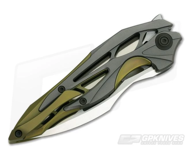 The model 906C Arrakis was the predecessor to the Isham Eschaton design and though they were not produced chronologically you can easily see the similarities in design. This eclectic design produced by WE Knife Company is a limited edition production designed by Elijah Isham that is out of this world. The Arrakis utilizes the same unique design to creates an integral folder that delivers a full-size titanium construction in a sub 4 oz. package. This version of the futuristic folder has a satin finished Bohler M390 blade and Gray on Gold 6AL4V Titanium scales. This highly stylized yet functional design is limited in production making it ideal for collectors and users alike.