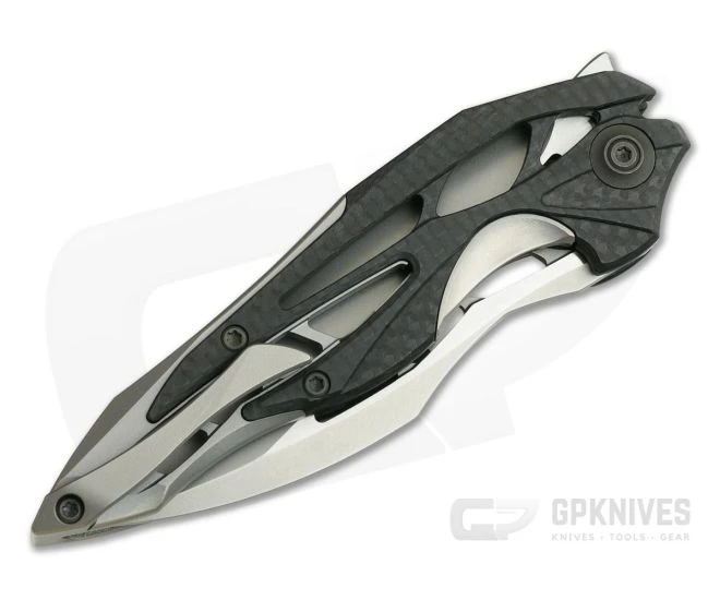 Handle: The handles are even more striking in the design and construction with the skeletonized pattern in the blade cutout flowing into the handle for a futuristic or alien-like appearance. Despite the unusual visual style of the handles they are highly comfortable and ergonomic with a smooth, integral construction that is not only strong but stylish and comfortable. The milling and cutouts of the carbon fiber-on-titanium handles helps reduce weight and add traction in the hand with an index finger cutout that enhances security and hides the index flipper when the blade is deployed. An inset steel liner delivers smooth operation and worry free lockup with minimal addition to the weight. Gray titanium hardware keeps it all together.