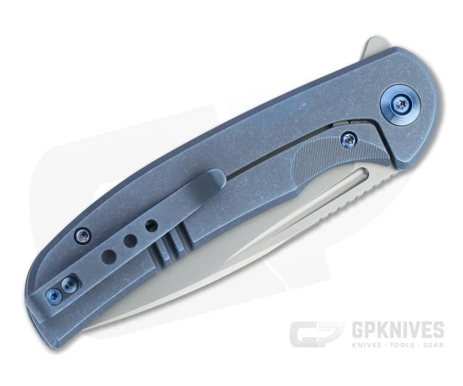 Clean, stylish and functional, the WE Knives Beacon is a shining example of what works in a daily carry folder. Reliable titanium frame lock construction pairs with a classic drop point blade of high performance CPM-20CV to deliver an efficient cutting tool that looks good while getting the job done. This version comes with a fine bead blasted blade and stonewashed blue titanium handle.