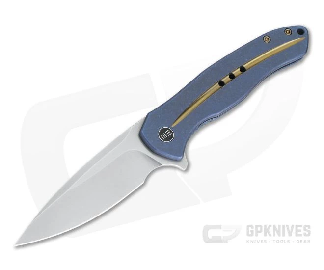 Handle:Â Handle construction consists of dual tumbled blue titanium slabs with a decorative, gold anodized milled groove on the front. The back is a solid slab of titanium milled with an integral frame lock with steel lock face insert for smooth, reliable and secure lockup for the life of the knife. Frame and back spacer are matching, tumbled blue titanium which complement the bronze anodized titanium hardware. A slim, elegant and ergonomic design fits as well in the pocket as it does in the hand and all at under 3 ounces.
