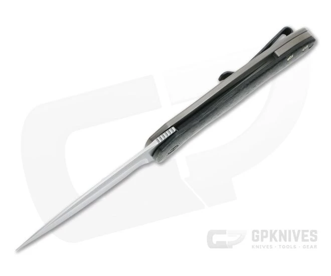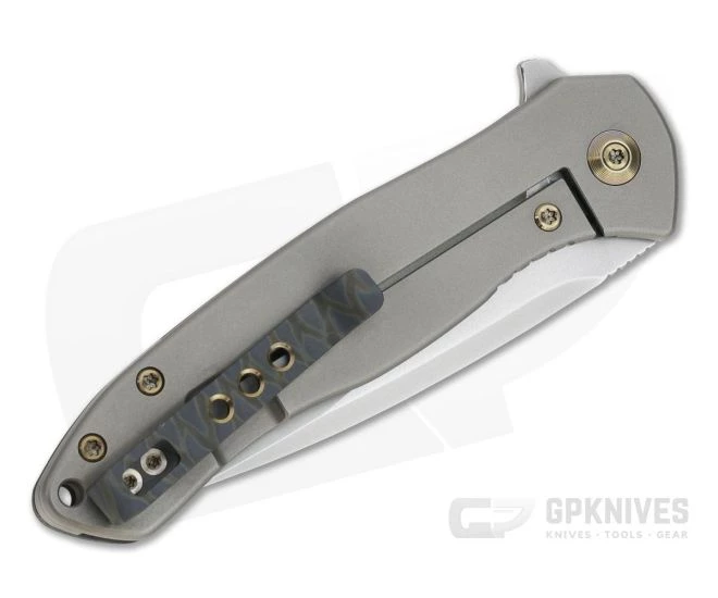 Handle:Â On the front a titanium liner supports a sleek and stylish Shredded Carbon Fiber which also delivers a sub-2.5 ounce weight. The back is a solid slab of titanium milled with an integral frame lock with steel lock face insert for smooth, reliable and secure lockup for the life of the knife. Liner, frame and back spacer are tumbled gray titanium contrasting nicely with the bronze anodized titanium hardware. A slim, elegant and ergonomic design fits as well in the pocket as it does in the hand.