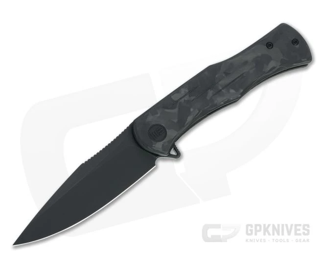 The WE Knives Primoris is a shark-like tactical EDC flipper with aggressive style and precision construction. Black stonewashed CPM-20CV gives top end performance on the harpoon blade, while the matching titanium frame is rock solid, paired with a striking marbled carbon fiber front scale and visually appealing “tail”.