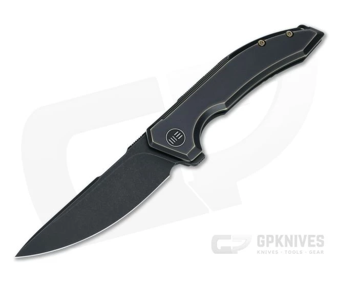 The WE Knives Quixotic is a modern titanium flipper with an industrial design. Chamfered edges on the straight spine of the blade are echoed in the handle which has fluted milling and a proud back spacer for comfort and style. This version comes with a black stonewashed CPM-20CV blade and antique bronze and black titanium handles.
