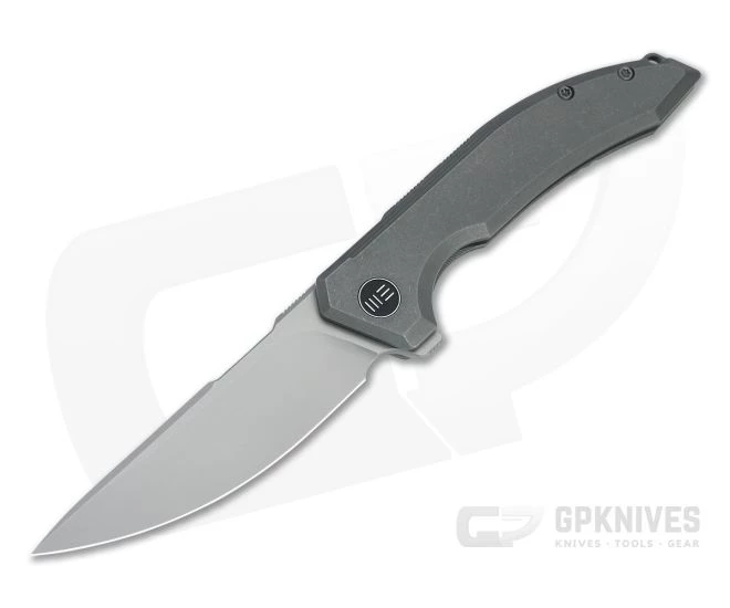The WE Knives Quixotic is a modern titanium flipper with an industrial design. Chamfered edges on the straight spine of the blade are echoed in the handle which has fluted milling and a proud back spacer for comfort and style. This version comes with a silver bead blasted CPM-20CV blade and stonewashed gray titanium handles.