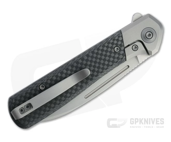 Handle:Â Solid gray titanium bolsters with integral liners top handsome carbon fiber scales for a solid, stylish handle sitting somewhere between a traditional swayback and Barlow shape. The simple handle shape is allowing multiple grips with a weight reducing open construction and subtle index guard for safety. Accessed via the rear bolster, the steel lock face equipped integral frame lock is smooth and reliable with solid lockup for safe use.