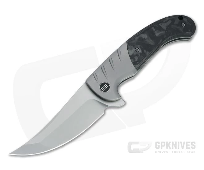 The Curvaceous marks the first collaboration between custom maker Eric Ochs and WE Knives. Based on his custom Persian design the Curvaceous has a large trailing point blade with a striking compound grind and hand filling ergonomic handle well suited to serious use. This version comes with a silver bead blasted CPM-20CV blade and gray titanium handles with marbled carbon fiber overlays.