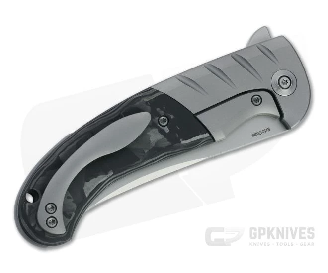 Handle: Titanium bolsters and integral liners support handsome marbled carbon fiber overlays for a solid, balanced handle. A pronounced guard and pommel swell offer a secure grip with deep chamfered edges for comfort. The steel lock face equipped frame lock delivers seamless operation and solid lockup for safe use.