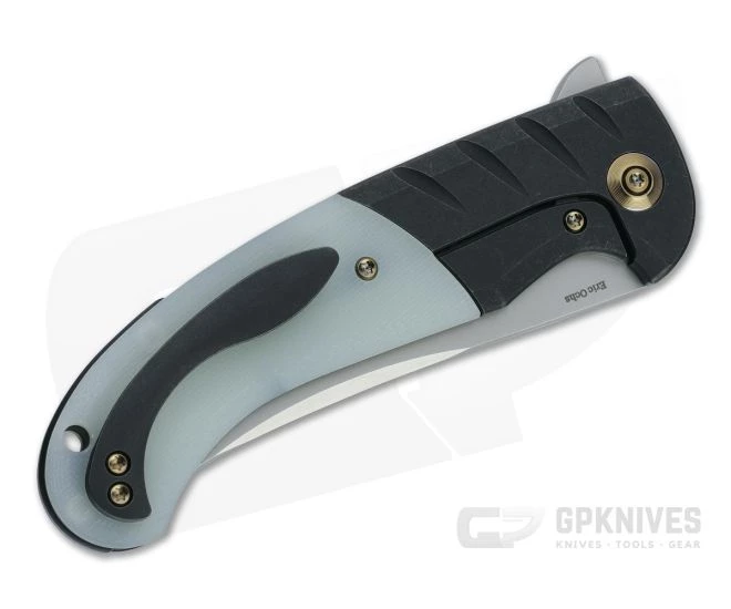 The Curvaceous marks the first collaboration between custom maker Eric Ochs and WE Knives. Based on his custom Persian design the Curvaceous has a large trailing point blade with a striking compound grind and hand filling ergonomic handle well suited to serious use. This version comes with a silver bead blasted CPM-20CV blade and black stonewashed titanium handles with translucent ‘Jade Green’ natural G10 overlays.
