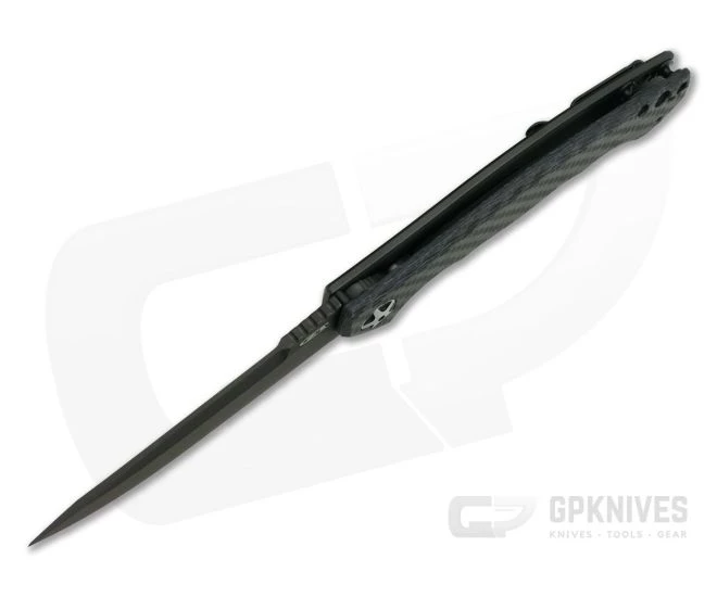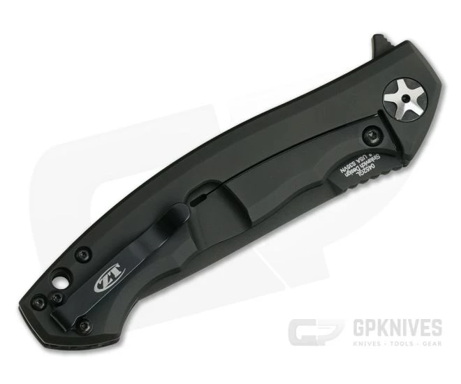 Blade: The long drop point so fancied by ZT enthusiasts for severeal years now remains built from choice S35VN steel on this run. The grinds, including the dagger-like upper swedge, have a dark-as-night Black DLC (Diamond-Like Carbon) coated finish for a bulletproof look on each. Small thumb rest, jimped flipper tab and KVT Bearings system are all accounted for. This piercer just flies and my is it easy on the eyes.